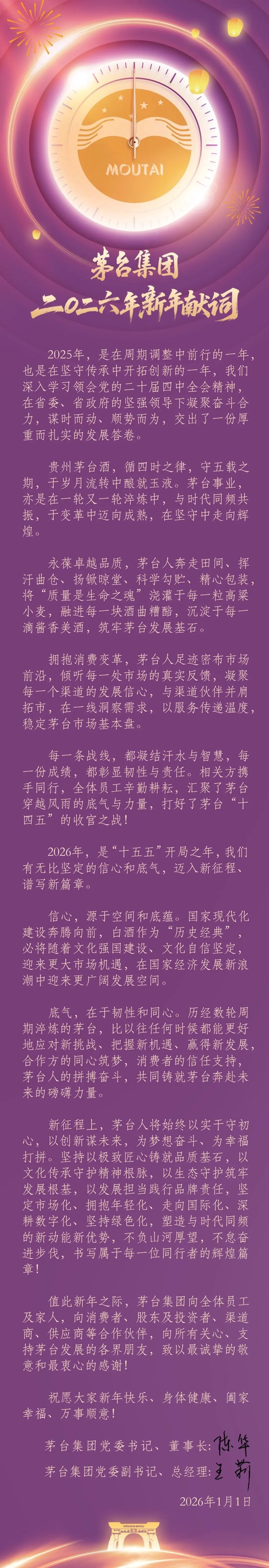 值此新年之际,茅台集团向全体员工及家人、向消费者、股东及经营者、渠道商、供应商等合作伙伴,向所有关心、支持茅台发展的各界朋友,致以最诚挚的敬意和最衷心的感谢!