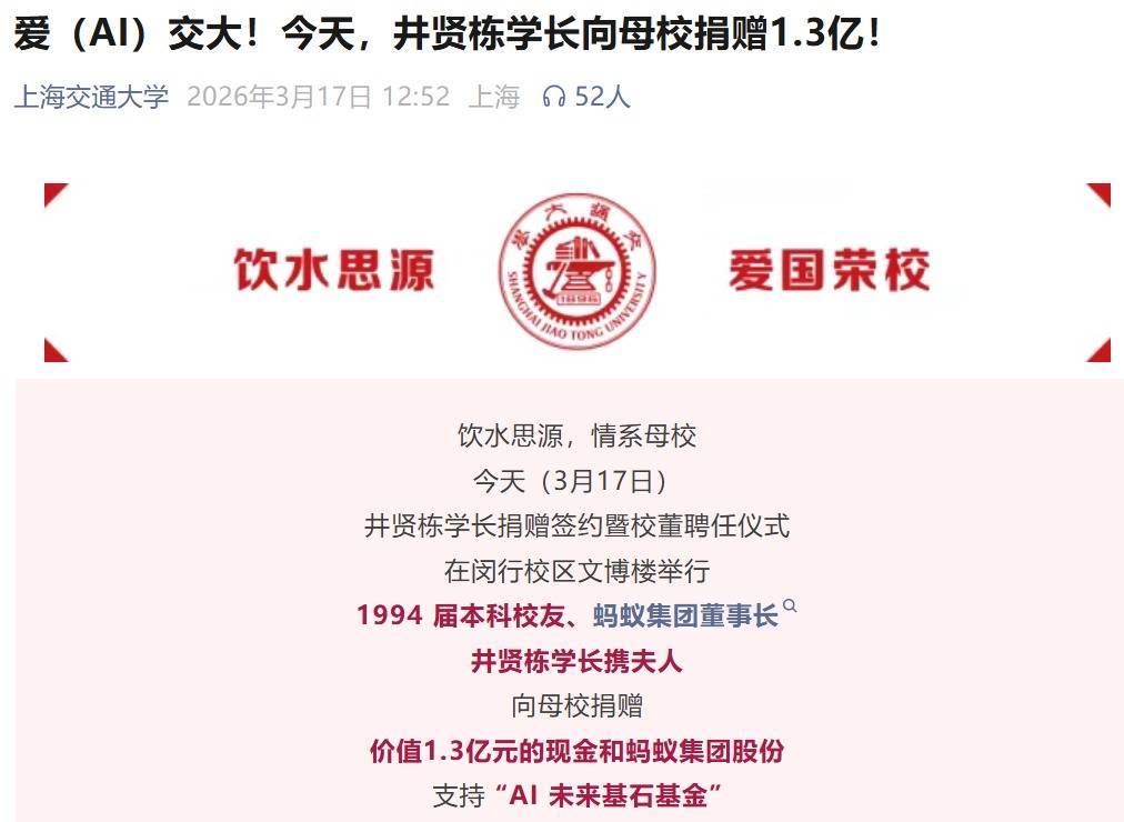 2026年3月17日股票配资最新资讯,上海交通大学建校130周年之际,蚂蚁集团董事长、1994届校友井贤栋与夫人共同向母校捐赠价值1.3亿元现金及蚂蚁集团股份,设立“AI 未来基石基金”,用于人工智能领域科研创新与人才培养。校方同期聘任井贤栋为校董,这场捐赠成为顶尖高校与科技企业深化产研合作的标志性事件。