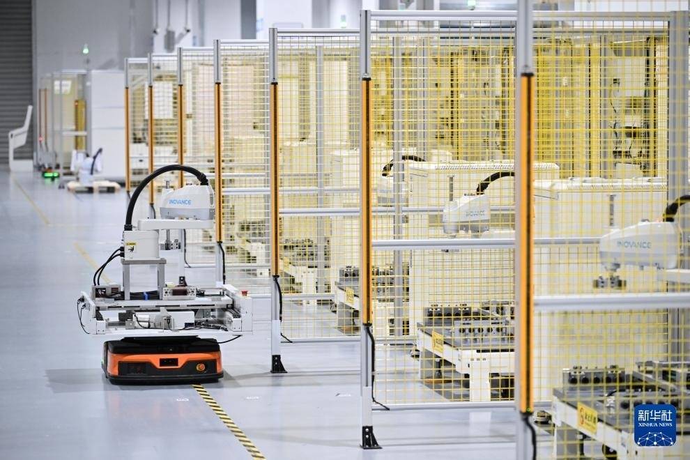 3月17日,在位于南京市江宁开发区的汇川技术南京基地自动化车间内,AGV小车在搬运完成测试的机器人。新华社记者 季春鹏 摄