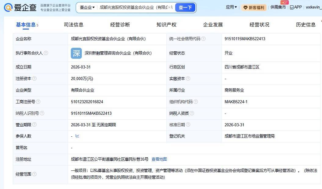 爱企查网站显示,成都光宜股权投资基金合伙企业(有限合伙)于3月31日正式成立配资平台网,出资额为2亿元。信息显示,该基金的经营范围包含以私募基金从事股权投资、投资管理、资产管理等活动。