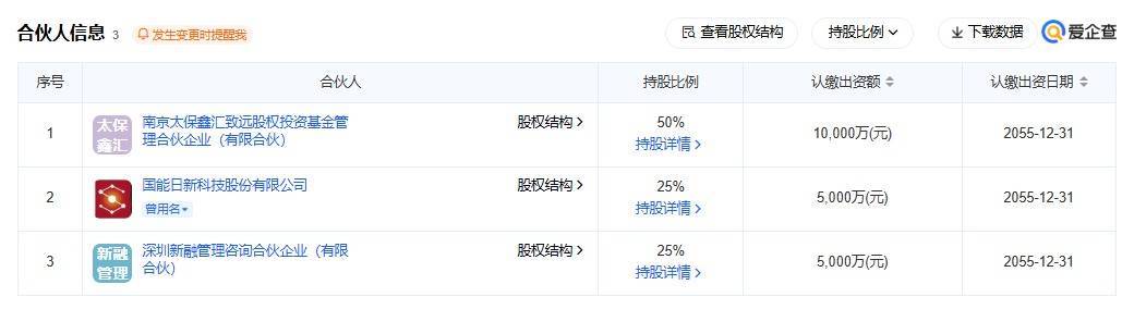 股权穿透则显示,该合伙企业由中国太保旗下的南京太保鑫汇致远股权投资基金管理合伙企业(有限合伙)、国能日新科技股份有限公司、深圳新融管理咨询合伙企业(有限合伙)共同出资设立,分别持股50%、25%、25%。