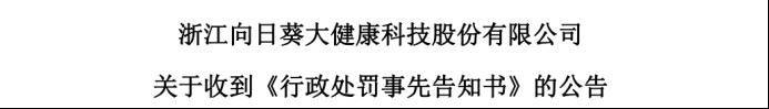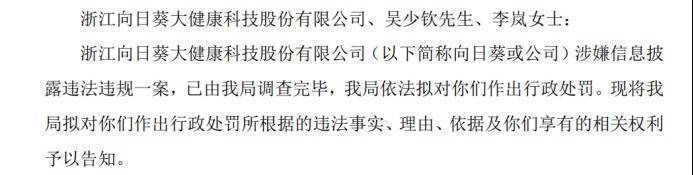 3月2日,浙江向日葵大健康科技股份有限公司(下称“向日葵”)收到中国证券监督管理委员会浙江监管局出具的《行政处罚事先告知书》,因在披露《发行股份及支付现金购买资产并募集配套资金暨关联交易预案》(下称“《预案》”)中存在误导性陈述,对向日葵及公司相关责任人给予警告,并合计处以510万元罚款。