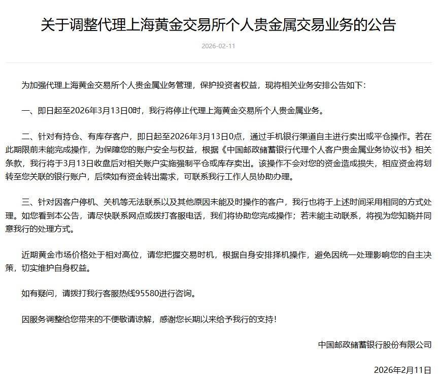 比如,2月11日,邮储银行宣布,即日起至2026年3月13日0时,该行将停止代理上海黄金交易所个人贵金属业务;针对有持仓、有库存客户,即日起至2026年3月13日0点,通过手机银行渠道自主进行卖出或平仓操作。若在此期限前未能完成操作,该行将于3月13日收盘后对相关账户实施强制平仓或库存卖出。