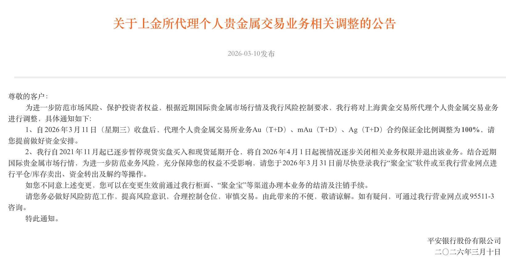 【大河财立方消息】3月10日,平安银行公告称,为进一步防范市场风险、保护投资者权益,根据近期国际贵金属市场行情及该行风险控制要求,平安银行将对上海黄金交易所代理个人贵金属交易业务进行调整。